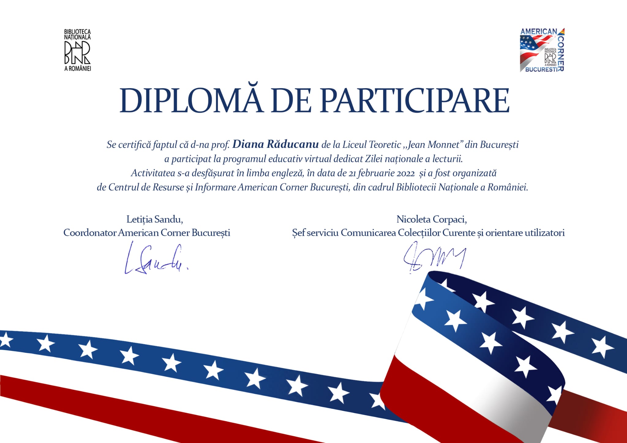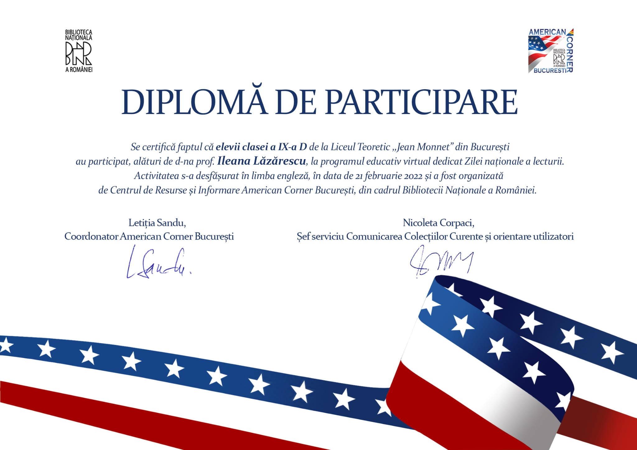 Elevii claselor de engleza intensiv, 7C, 9A si 9D au participat la programul educativ virtual dedicat Zilei Nationale a Lecturii. Activitatea s-a desfasurat in zilele de 15 februarie si 21 februarie 2022 si a fost organizata de Centrul de Resurse si Informare American Corner Bucuresti, din cadrul Bibliotecii Nationale a Romanaiei. Au fost lecturate pasaje din literatura americana si discutate in limba engleza (coordonator prof. Ileana Lazarescu si Anne Sebesan) dar si in limba romana (coordonator prof. Diana Raducanu).